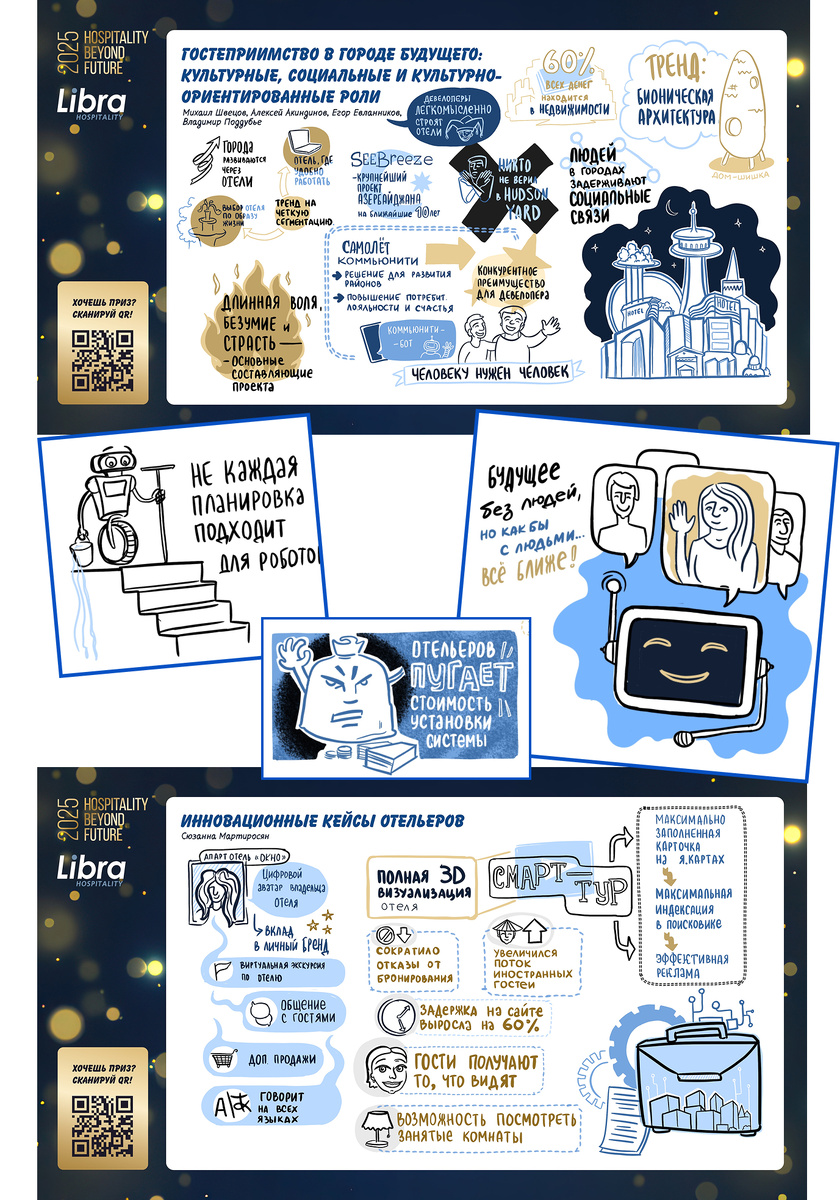 Цифровой скрайбинг на форуме Гостинечного Бизнеса Hospitality Beyond Future 2025. Два дня, два скрайбера. 3 зала Работаем на этом форуме уже второй год. Честно скажу: жду приглашение на третий! Потому что это ОЧЕНЬ интересное событие. Внутрянка гостиничного бизнеса, автоматизация, тренды, ИИ-повестка. Всё стало освещено и зафиксировано на картинках. Интересное решение организаторов — подгрузить файлы скрайбинга в приложение форума. В общей сложности получилось чуть более 30 скрайбов. Показываю некоторые из них: