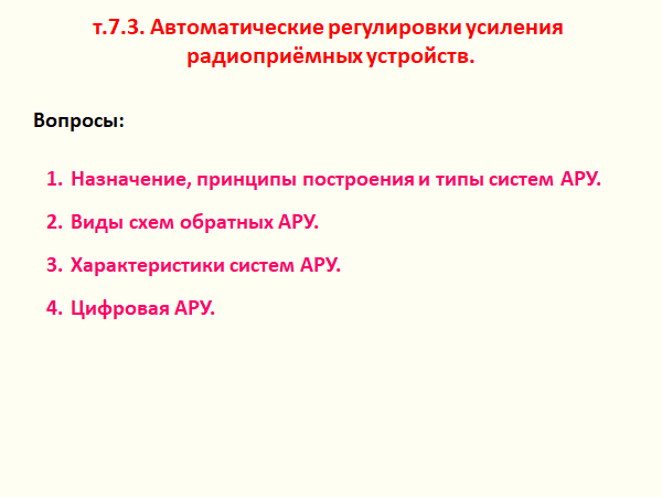 его входе. Система АРУ обеспечивает поддержание на выходе последнего усилителя промежуточной частоты (на входе детектора) уровня сигнала, достаточно высокого и стабильного для воспроизведения сообщений от радиостанций различной мощности, находящихся на разных расстояниях и в меняющихся условиях распространения радиоволн. На практике обычно не требуется строгого постоянства выходного напряжения и для упрощения конструкции регулятора допускается его изменение в таких пределах, чтобы не возникли заметные перегрузки выходных ка