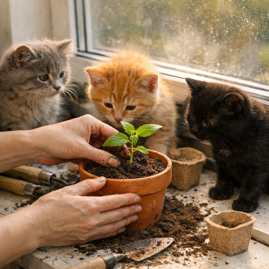 Ольга сеяла в январе — и жала в марте! Лайфхак: Влажность 60-70% — ставьте поддон с влажным керамзитом или миску с водой. Пульверизатор ежедневно, но не переливайте (корни гниют). Для котят: зелень в "тендере" — отдельный горшок, чтобы не жевали все. Ее редиска взошла за 5 дней при 18°C — комнатная температура идеальна.