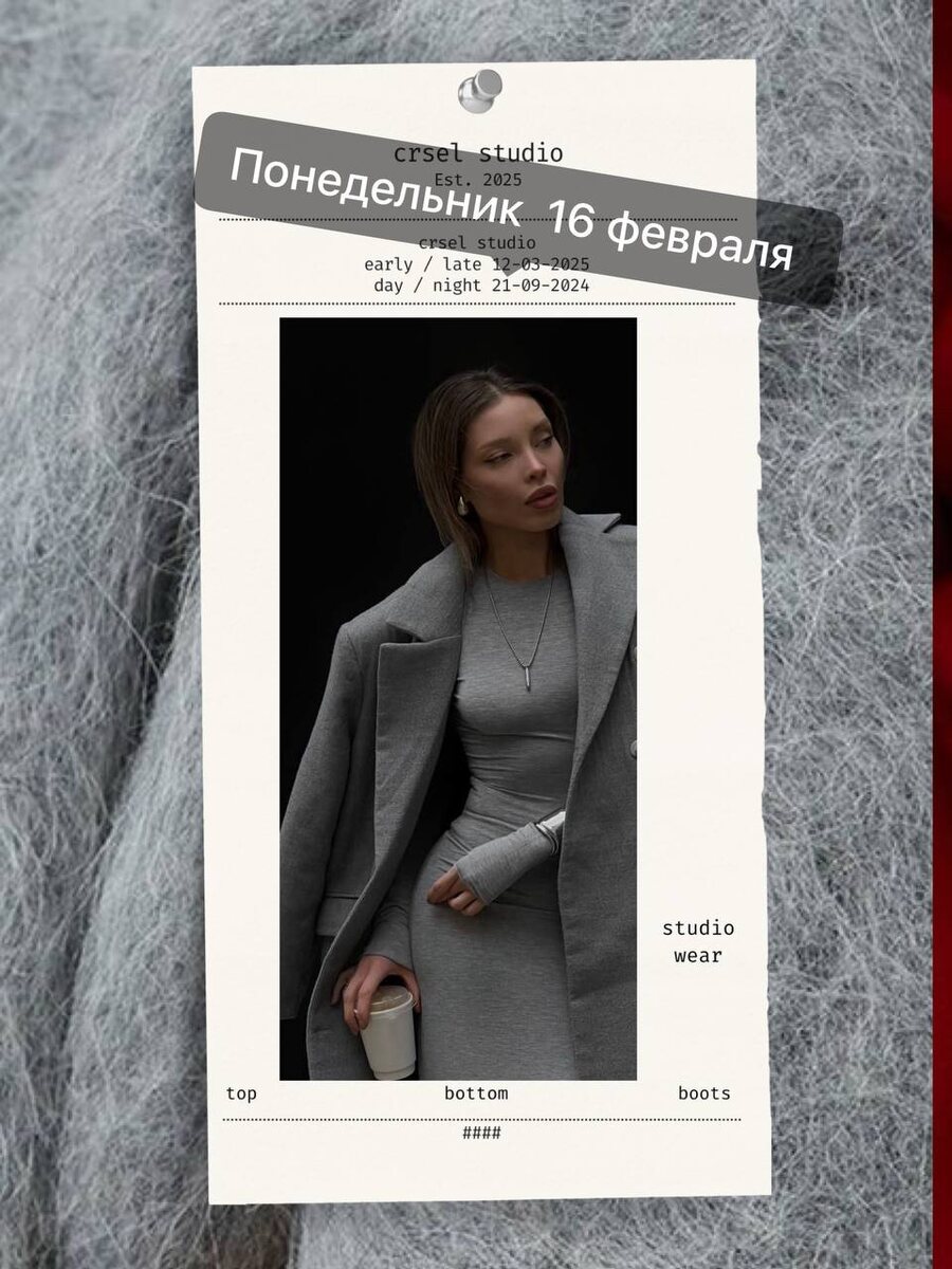 День Луны • Луна в Водолее • Аркан Башня День резких осознаний и внутренней перестройки. Важно выглядеть собранно и держать опору внутри. База — холодные оттенки: серый, графит, белый, чёрный. Цвет дня (Луна) — светлые тона: молочный, жемчужный, светло-серый. Они смягчают напряжение и дают ощущение чистоты. По вещам — чёткие линии: жакет, прямые брюки, структурная рубашка, лаконичное платье. Детали: серебро, геометрия, сумка жёсткой формы, минималистичная обувь. Образ — ясность и внутренняя устойчивость.