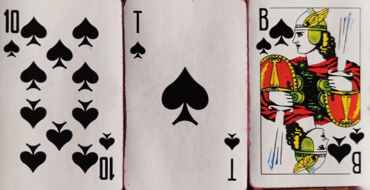 Выкладываете три карты подряд: первая выпала 10 пик, вторая — туз пик, третья — фигурная карта Валет пик.