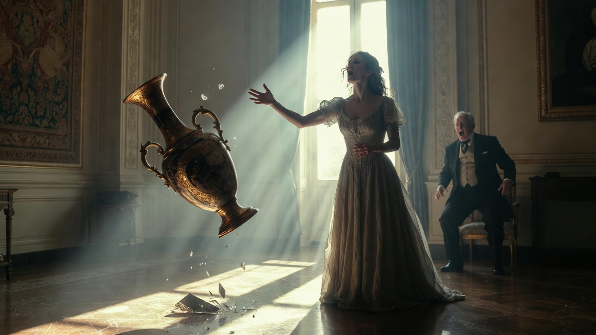 Ваза рухнула на мраморный пол и разбилась с оглушительным, чистым звоном. Осколки брызнули во все стороны, засверкали в солнечном свете, как рассыпанные драгоценности. Наступила мёртвая тишина.