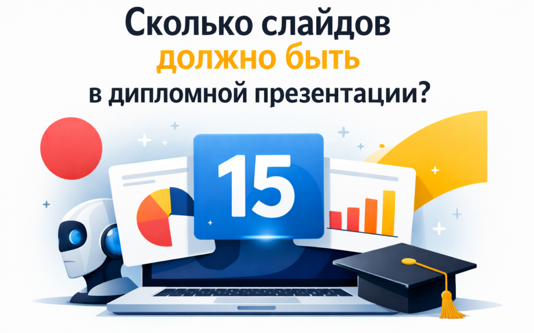 Когда выходишь на защиту с 30 слайдами на 10 минут, комиссия перестаёт слушать уже на пятой минуте — ты спешишь, информация не усваивается, вопросы сыплются неудобные. Обратная ситуация: 5 слайдов выглядят поверхностно, словно тема не раскрыта. Баланс между временем и информацией определяет, пройдёт защита спокойно или превратится в допрос.На практике столкнулся с этим, когда готовил презентацию за ночь — загрузил текст диплома в Presentacium, выбрал научный стиль и 12 слайдов. Сервис за 3 минуты создал структуру с нужным количеством разделов, осталось подкорректировать цифры. Результат: уложился в 10 минут, комиссия кивала одобрительно. Главный принцип — 1 слайд на 40-60 секунд доклада, итого для стандартной защиты нужно 10-15 слайдов.Разберём, сколько слайдов должно быть в презентации к диплому по нормативам вузов, как распределить их по структуре и избежать типичных ошибок, которые портят впечатление даже от сильной работы.