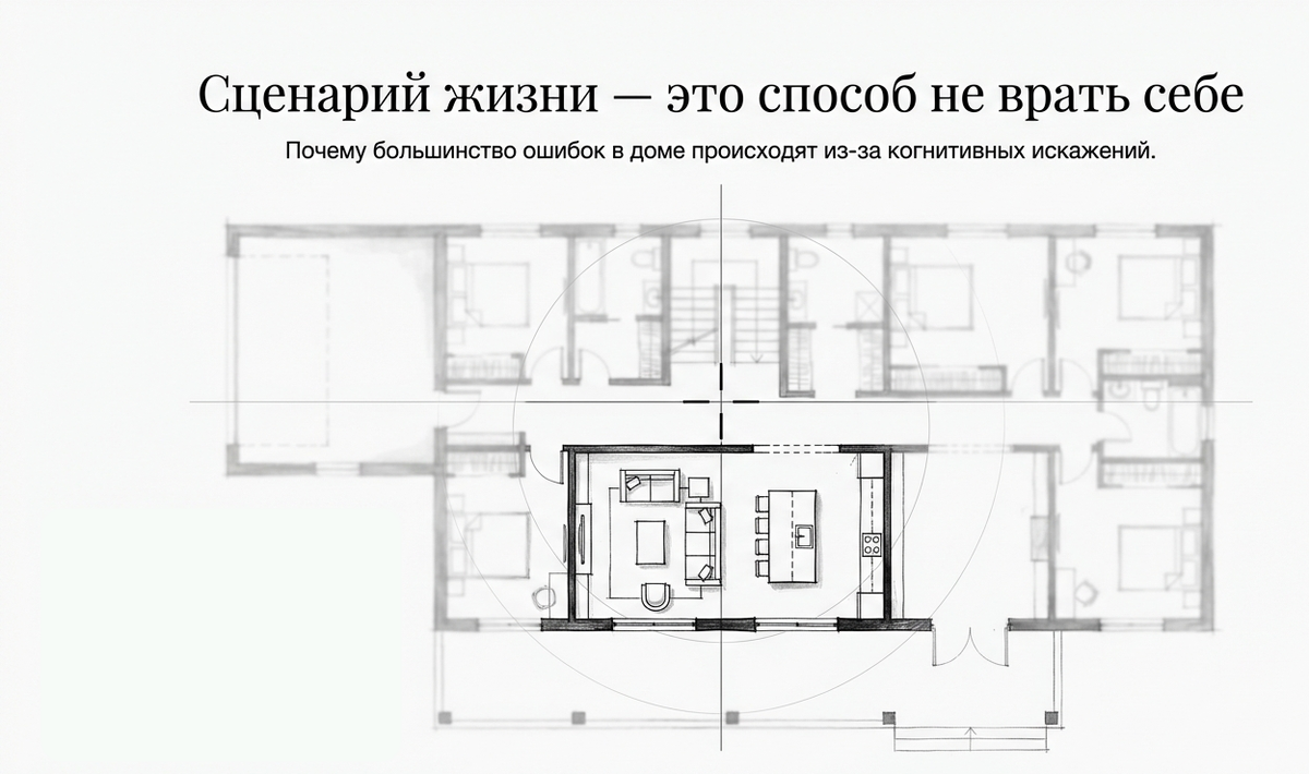 Они возникают по другой причине — мы обманываем сами себя. Мы проектируем дом для идеальной версии себя. для человека, который готовит каждый день, занимается спортом по утрам и собирает гостей по выходным. А живём — совсем по другому сценарию. В итоге получается красивый, дорогой, но неудобный дом. Лаборатория Сценариев Загородной Жизни разработала методику «Маяк», которая обходит эти искажения. Проблема в том, что мы системно переоцениваем редкие события и недооцениваем повседневность. Нам кажется, что гостиная должна быть большой — «вдруг будем часто принимать друзей». Кухня — просторной, «вдруг начну готовить». Нужен кабинет, спортзал, отдельная комната на будущее. Но если честно посмотреть на реальность, становится понятно: 70–80% жизни проходит в повторяющихся действиях. Сон, работа, бытовые процессы, дорога. И только 15–25% времени остаётся тем самым «настоящим» — тем,