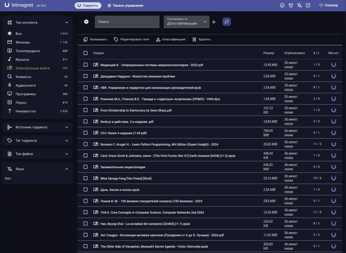 🧲 У меня давно шаблон действий, если что-то нужно найти на торрентах, то я обычно не иду на какой-либо трекер. А иду на https://btdig.com/ базу всего, что было когда либо было в DHT. Что есть DHT? Distributed Hash Table — распределенная хеш-таблица. Так вот проблема, что btdig остался последним рабочим из всего списка который был у меня и сегодня чёт прилёг и он, а значит время пришло... Такой поисковик позволяет найти крайне редкие файлы, которые снесли с трекеров или никогда не размещались в них, но доступны в сети. Децентрализация во всей красе так сказать :) В итоге нашёл проект https://github.com/bitmagnet-io/bitmagnet разворачивается супер просто через docker-compose, на любой 24/7 машинке с большим диском и дальше он растит вам вашу собственную базу того, что есть в сети. Первый час очень прикольно наблюдать, напоминает время eDonkey/DC++ когда можно просто смотреть чё в сети новенького есть. Docker-compose тута Доступен будет на IP-Машины:3333 В комментариях можете напис