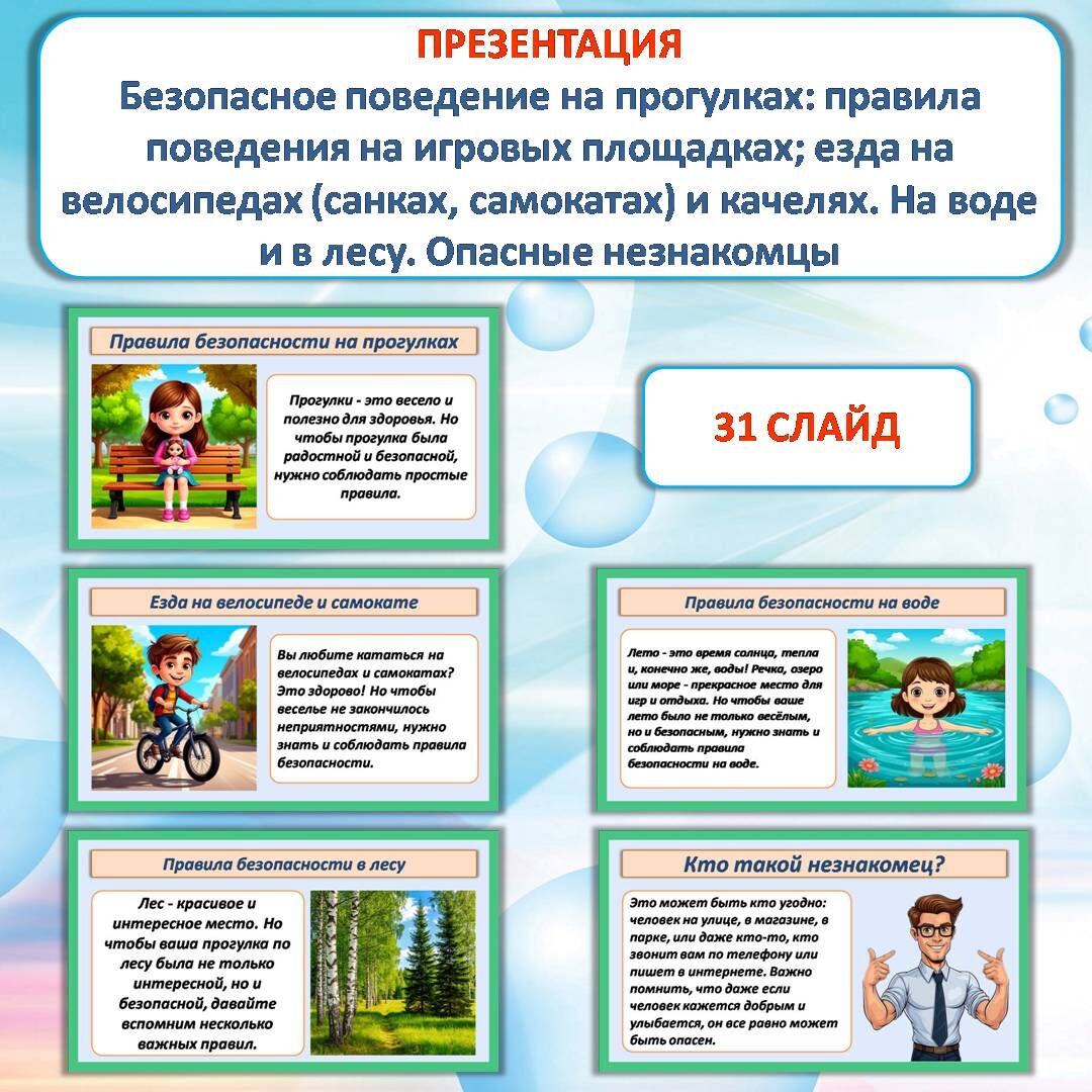 Презентацию скачать здесь Презентация «Безопасное поведение на прогулках: правила поведения на игровых площадках; езда на велосипедах (санках, самокатах) и качелях. На воде и в лесу. Опасные незнакомцы» разработана к уроку окружающего мира во 2 классе. Данная разработка станет хорошим визуальным сопровождением не только для урока, но и для внеклассных мероприятий со схожей тематикой. Текст презентации написан простым и понятным языком, легко читается, слайды не перегружены информацией, что способствует лучшему усвоению материала. Красочные иллюстрации помогут оживить ваш урок и вызовут интерес у учащихся. Презентация состоит из 31 слайда. Содержание презентации: Слайд № 1. Титульный слайд. Слайды № 2-7. Правила безопасности на прогулке (игра в безопасных местах, незнакомые предметы, незнакомые животные, катание с горки, катание на качелях) Слайды № 8-9. Правила безопасности при езде на велосипеде и самокате. Слайд № 10. Правила безопасности при езде на санках. Слайды № 11-15. Правила б