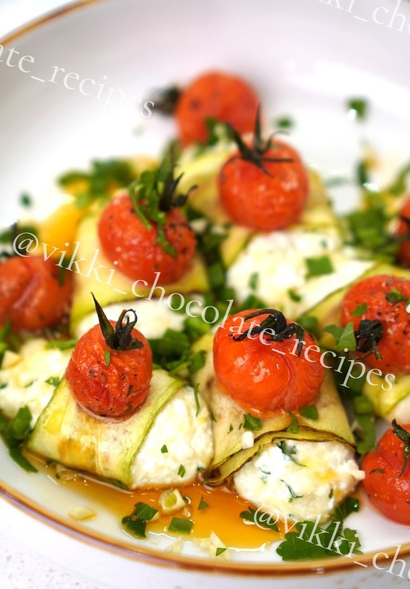 *на 10 шт основа: 🥒цукини 250 начинка: 🐮творог в пачке 180 🧀сыр полутвердый 80 🌱петрушка 1 веточка 🧂соль подача: 🍅черри 150 🫒оливковое масло 🥄соль, сухой чеснок по 1/2 чл 🧅зеленый лук 1 перо 🌱петрушка 1 веточка 🧄чеснок 3 з 🌶острое масло 1 сл для основы - цукини нарезаем или натираем на тонком слайсе и обжариваем до золотистости, промакивая бумажным полотенцем от излишек масла для гарнира - черри перемешиваем с маслом и специями и отправляем в разогретую до 200 духовку на 20 мин для начинки - натираем сыр, петрушку измельчаем и перемешиваем все ингр-ты до однородности. выкладываем по 1 чл на полоски цукини и сворачиваем рулетики, ввыпекаем в режиме гриль-конвекция при 200-7 мин сервируем - на готовые рулетики выкладываем черри, посыпаем зеленью и поливаем острым маслом✨ ❗️а если вы любите вкусно кушац, но не любите придумывать меню и считать ккал, то в моём tg-канале https://t.me/vikkichocolate/132 имеется балдежное меню на неделю с КБЖУ, порциями и списком продуктов🤍
