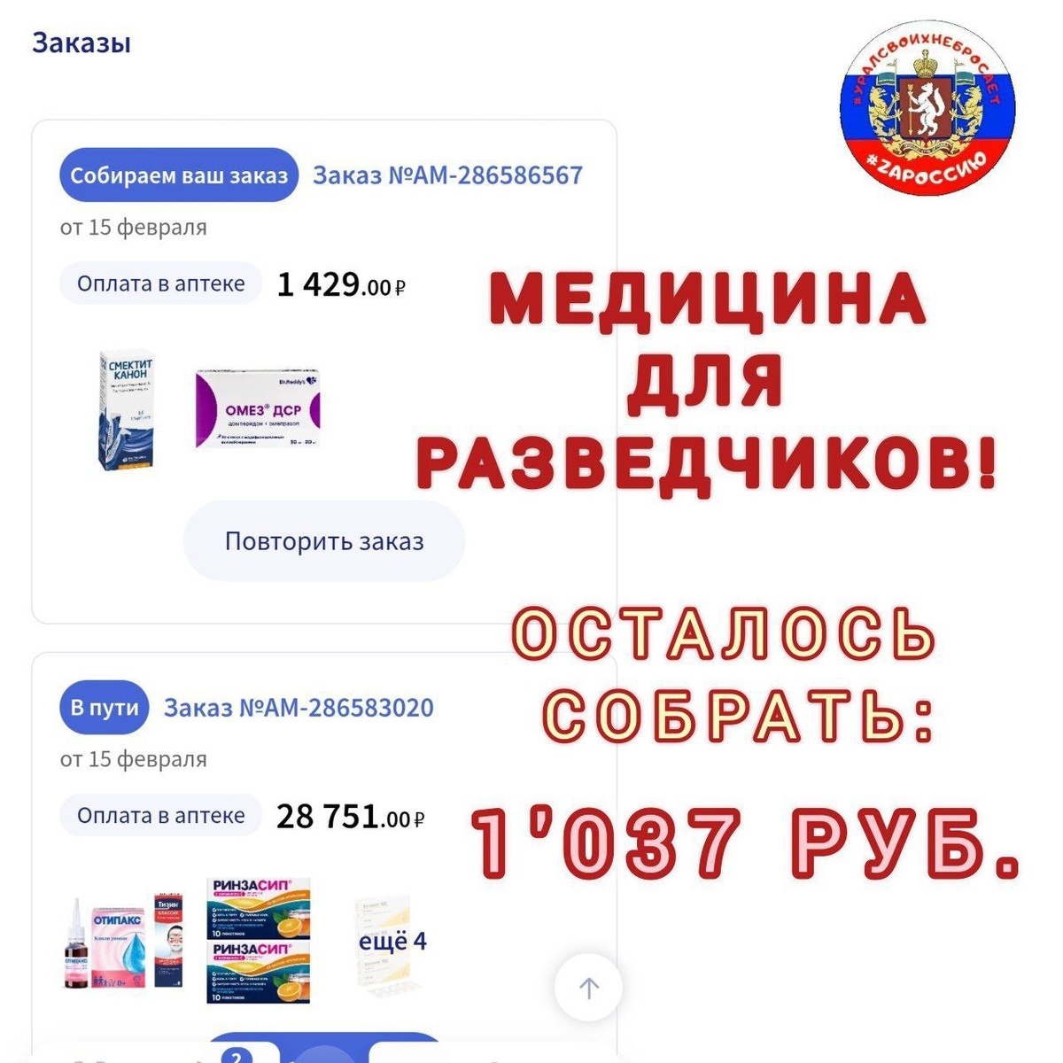 Оплата будет при получении. Спасибо вам огромное за поддержку этого сбора 🙏❤️ https://dzen.ru/media/id/5f5722409080502492578287/druzia-69885a22c3e4f253e377fe31 Сумма заказа - 30'180 руб. На данный момент у нас собрано - 29'143 руб. Нам остаётся собрать всего - 1️⃣0️⃣3️⃣7️⃣ руб. ⚡️ Давайте поможем нашим разведчикам🙏 Любую посильную сумму можно перевести на номер карты: 💳 2202208842197205 или по номеру телефона 📞+79827362150 Получатель - Ирина Владимировна Ш. ("Сбербанк") #уралсвоихнебросает #вместемысправимся #медицинскаяпомощь