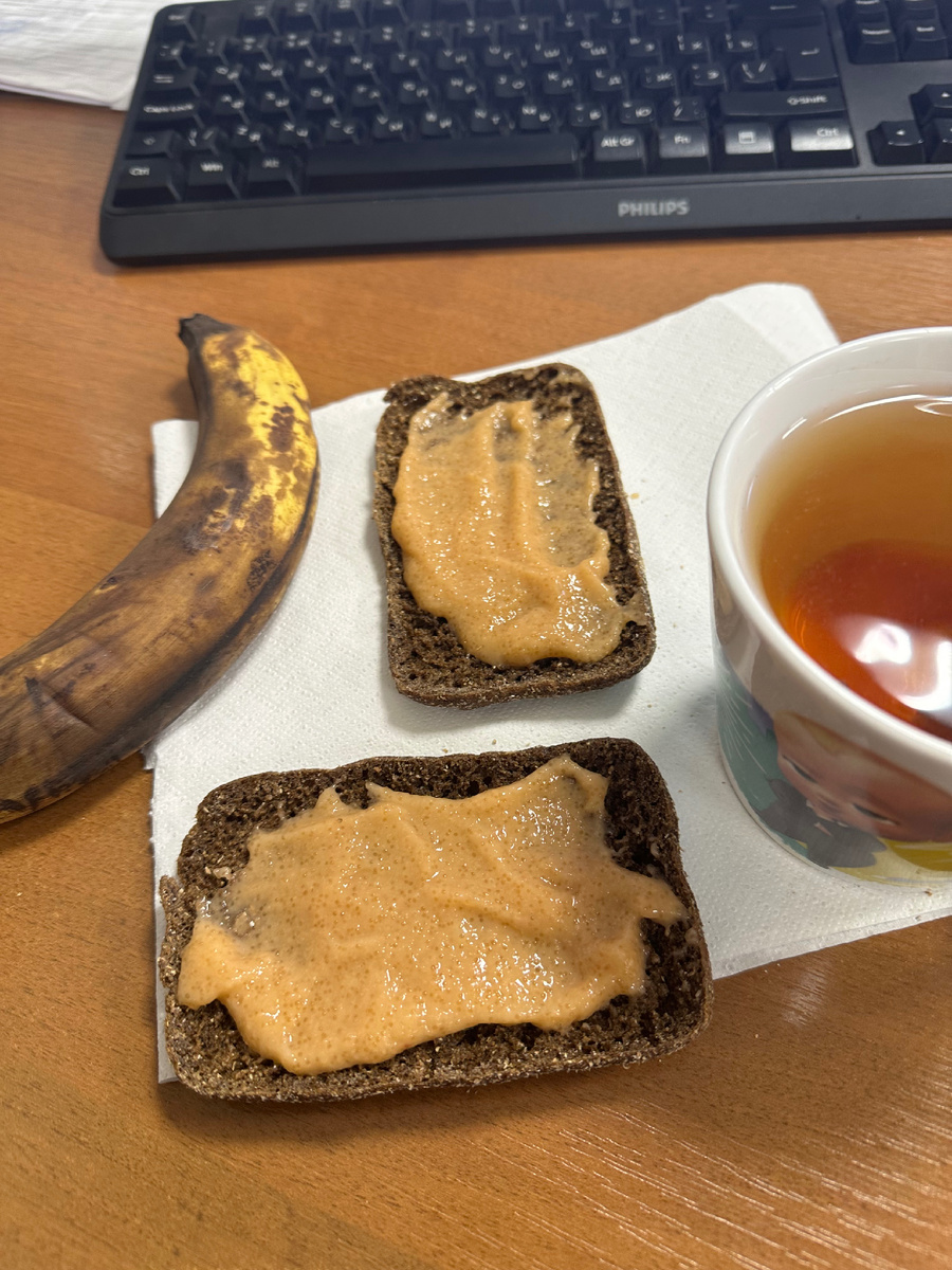 На перекус были бутерброды с икрой трески и банан. Банан не стала фоткать он еще более уставший, чем первый.