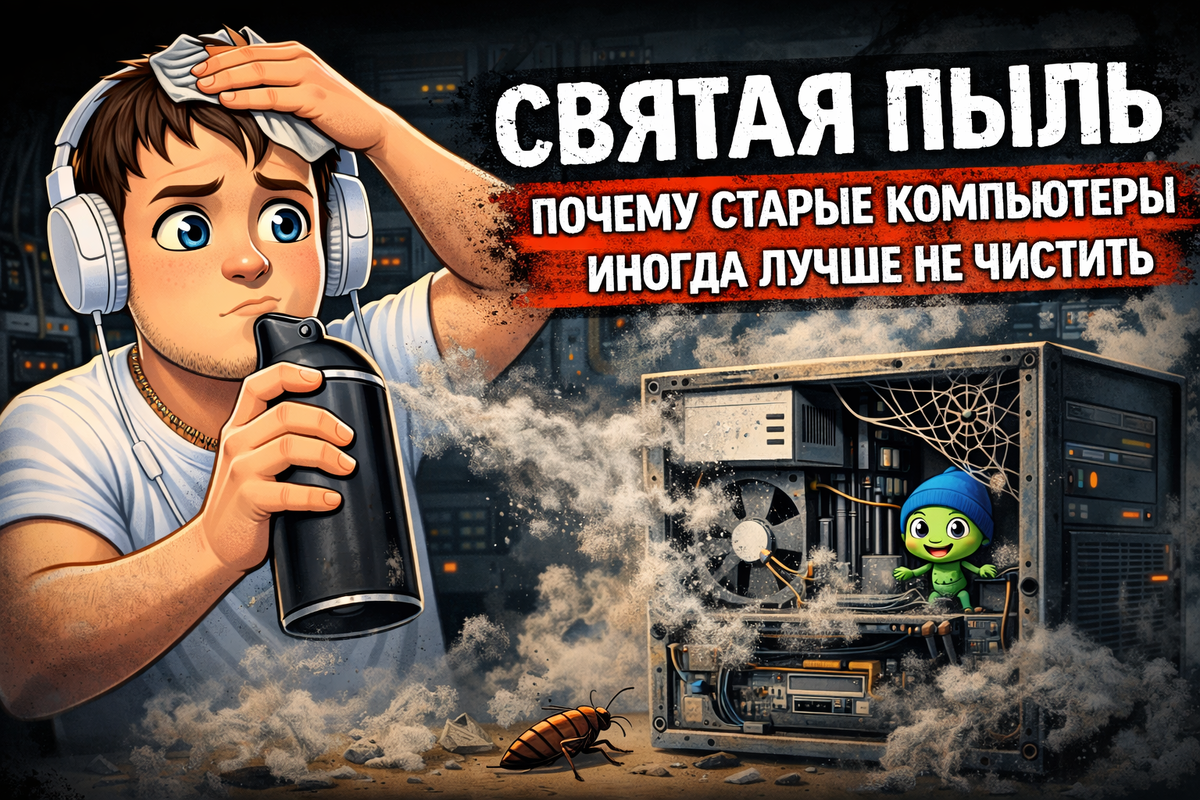 Я вам расскажу одну историю. Была она жарким летом, часов 7 вечера. Я сижу, лежу, никого не трогаю, и тут звонок: — Димас, привет, слушай, глянешь комп? Чёт он работает как-то странно. Принёс мне его знакомый, в целях анонимности назовём его Василий. Если рассказывать кратко о нём, человек простой, работяга. Технологии ему не особо интересны. Компьютер ему нужен для важнейших задач современности: посмотреть видосики. Принёс он мне свой системный блок родом из 2000-х. Там стояла Windows 7 — живая. Как и каким образом это всё работало — вопрос философский. Открываю крышку и понимаю — там уже поселилась новая цивилизация. Пыль лежала слоями, это не просто налёт, это целая геология. Если аккуратно собрать, можно было бы засыпать небольшую канавку где-нибудь на даче. Внутри явно жило «ОНО». Кулер вращался с характером человека, который устал, но держится. Блок питания дышал тяжело. Материнская плата выглядела так, будто пережила песчаную бурю. Я, как честный IT-специалист, решил всё сделать