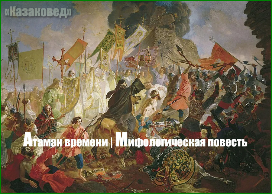 Это был Атаман Времени — величественный образ, вызывающий одновременно восхищение и страх. Он представляет собой бородатого старика невероятного роста, который словно сам вдохнул в себя могучую силу веков. Его густая, седая борода, струящаяся до груди, ниспадает, как белоснежный поток, символизируя мудрость и собранность. Из-под папахи выбивается пышный, яркий чуб, контрастирующий с его спокойным и суровым лицом, вылепленным временем и опытом.