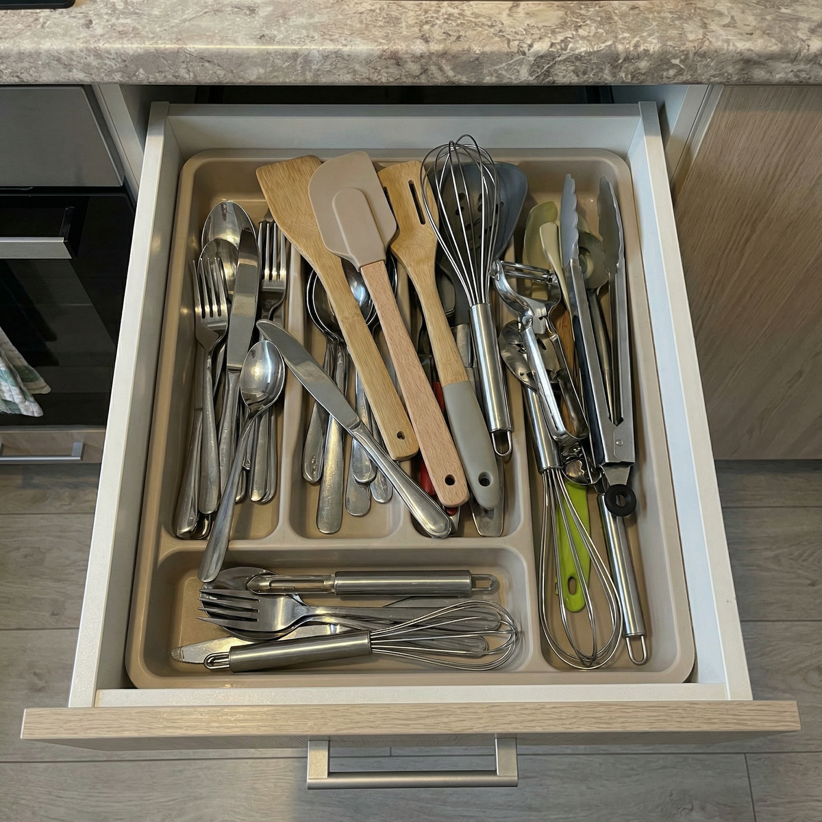 Периодически я устраиваю кухне мини-перезагрузку. Не генеральную уборку, не подвиг. Просто открываю ящики и честно смотрю — что там лежит. И каждый раз удивляюсь одному и тому же: мы храним намного больше, чем нам действительно нужно. Причём не потому, что жадные. А потому что «вдруг пригодится». Недавно решила заменить старый лоток для приборов. Он занимал только половину ящика, и вилки с ложками постоянно перемешивались. Я измерила тумбу — получилось 40 см. Обрадовалась, заказала раздвижной лоток на 30 см, подумала: отлично, ещё место останется. Когда он пришёл, вставила — и раздвигать оказалось некуда. Только тогда я поняла, что мерила шкаф снаружи, а не внутри. А внутри — те самые 30 см. Стояла с рулеткой и смеялась. Иногда проблема не в кухне, а в нас. Когда я вытащила всё содержимое ящика, оказалось: И ведь каждый раз казалось — всё нужно. На деле половина просто лежала. Я заметила одну интересную закономерность. Летом, когда приходят гости или мы готовим больше обычного, посуд