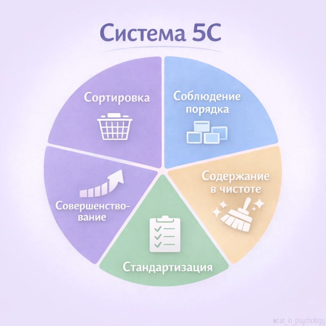 Система 5С – это про порядок, эффективность и ясность. Обычно ее используют на производстве или в офисе, но если посмотреть глубже, она идеально ложится на работу с внутренним миром – поведением, убеждениями и эмоциональными привычками Разберем каждый шаг так, чтобы он стал инструментом не только для рабочего стола, но и для психологической саморегуляции 1. Сэири – Сортировка Как это на рабочем месте Убирают все лишнее. Предметы делят на три группы: – используются часто – размещаются рядом – используются редко – убираются подальше – не используются – удаляются или отправляются в архив Как это работает в психике Внутри мы сортируем не по частоте, а по функции: – полезное и поддерживающее – оставляем и усиливаем (ценности, реальные потребности, конструктивные мысли) – нейтральное – признаем, но не держим в фокусе – вредное – выносим на разбор и трансформацию, даже если появляется часто (например, внутренний критик) Вопрос для себя: "Это помогает мне или мешает?" 2. Сэитон – Соблюдение по