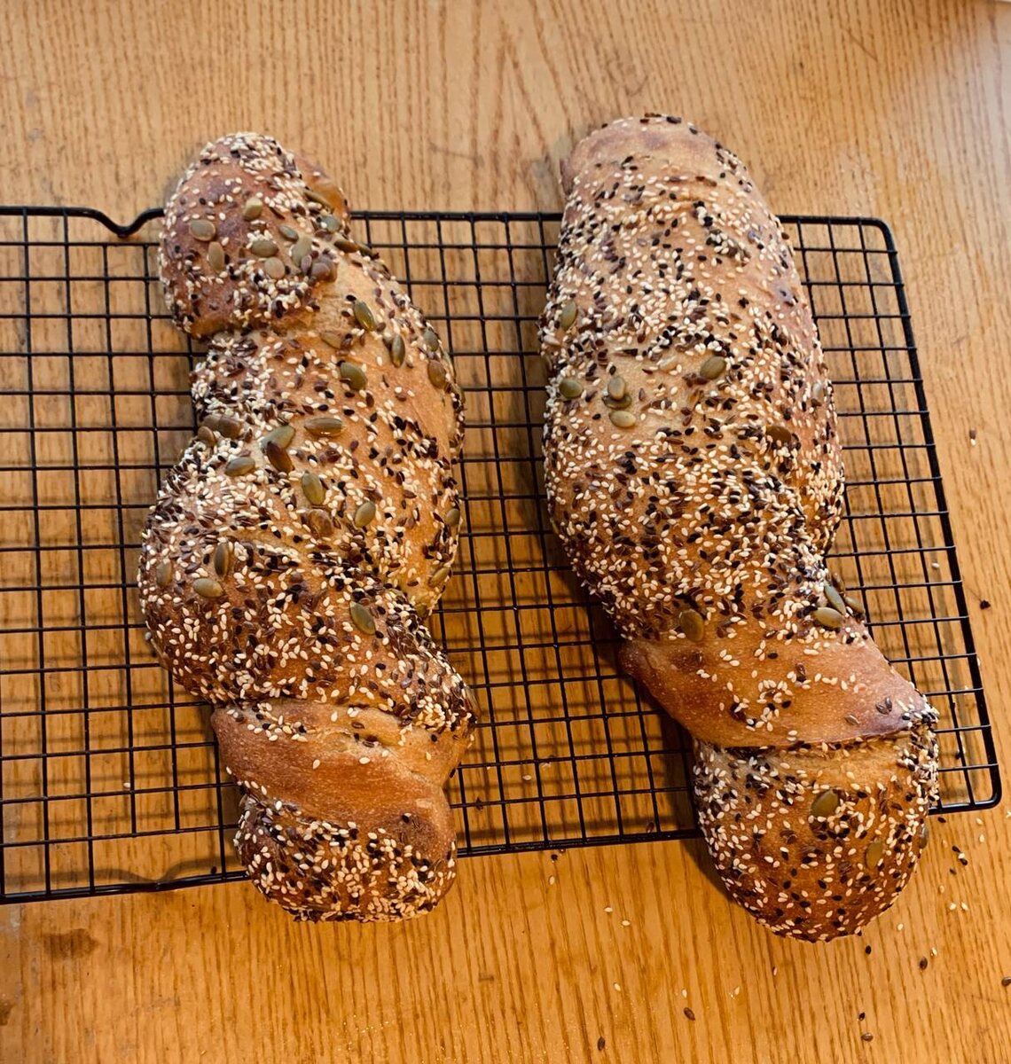 Лён, чёрный и белый кунжут, тыквенные семечки — в этой смеси перекручивала тесто 🌾 Корка получилась хрустящая, ореховая, живая ✨ Внутри — неровная пористость и лёгкая кислинка закваски 🤍 Это хлеб не про идеальность. Это хлеб про звук ломкой корочки и тёплое масло 🧈 ⸻ 📌 Рецепт (2-4 штуки) Ингредиенты: • 150 г активной пшеничной закваски (100%) • 285 г воды • 425 г муки (1 сорт + немного ц/з) • 10 г соли • смесь семечек: лён, кунжут чёрный и белый, тыквенные Как готовила: 1️⃣ Смешала воду и муку, оставила на 30–40 минут (автолиз). 2️⃣ Добавила закваску, затем соль. 3️⃣ Брожение 3–4 часа со складываниями. 4️⃣ Холодная ферментация в холодильнике (по желанию, но очень рекомендую). 5️⃣ Разделила тесто на полосы и перекручивала каждую в смеси семечек 🌾 6️⃣ Выпекала при 240–250°C: 10 минут с паром + 10–15 минут до тёмной корочки.