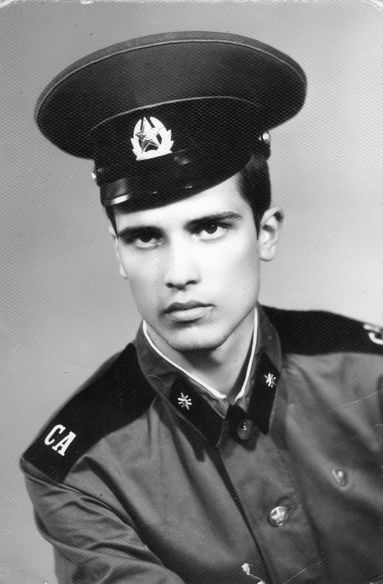 Рядовой войск связи (или РТВ ПВО) в закрытом кителе с нашивными погонами образца 1973 года.