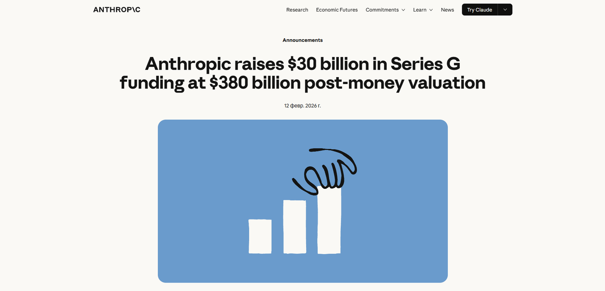 Компания Anthropic объявила о закрытии раунда финансирования серии G. Сумма привлеченных инвестиций составила 30 миллиардов долларов, а рыночная стоимость компании после сделки достигла 380 миллиардов. Раунд возглавили крупные инвестиционные фонды GIC и Coatue при участии Microsoft, NVIDIA и суверенных фондов. Несмотря на огромную оценку, финансовые показатели компании демонстрируют кратную динамику роста. Интересно взглянуть на темпы роста выручки компании за последние три года: Одной из главных точек роста стал инструмент Claude Code, запущенный в открытый доступ в мае 2025 года. На сегодняшний день: Недавно компания выпустила новую флагманскую модель — Opus 4.6. Основной упор в ней сделан на выполнение сложных офисных задач: работу с документами, презентациями и сложными таблицами. Модель показала лучшие результаты в тесте GDPval-AA, который оценивает эффективность ИИ в юридических и финансовых задачах. Также был представлен инструмент Cowork. Это расширение возможностей Claude Code