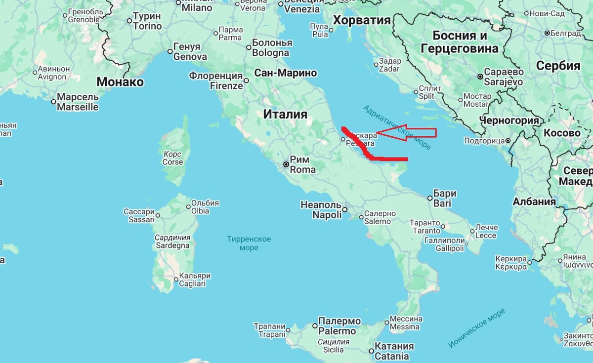 Адриатическое побережье Италии — это сплошная туристическая лента. Римини, Риччоне, Каттолика, Пескара. Тысячи отелей, апартаментов, пляжных клубов. Каждый свободный метр застроен, забронирован, забит лежаками. Но есть на этой карте одно место, где отели кончаются, причем резко, как будто кто-то провёл невидимую границу. Туристы, которые едут по трассе SS16 вдоль моря, замечают: Только что были вывески, зонтики, променад — и вдруг пустота. Километр за километром — только дикий берег, сосны и тишина. Это побережье называется Коста-деи-Трамути. Оно находится в Абруццо, между курортным городом Пескара и границей с Молизе. Вода там чистая. Пляжи широкие. Сосновые рощи подходят прямо к морю. Идеальное место для пятизвёздочного курорта. Вместо отелей, вдоль всего побережья, километр за километром, тянутся заборы, таблички с надписями – приватная территория, и старые, обветшалые виллы, которые явно не видели ремонта с 70-х годов. Там, где могли бы стоять современные отельные комплексы, распол