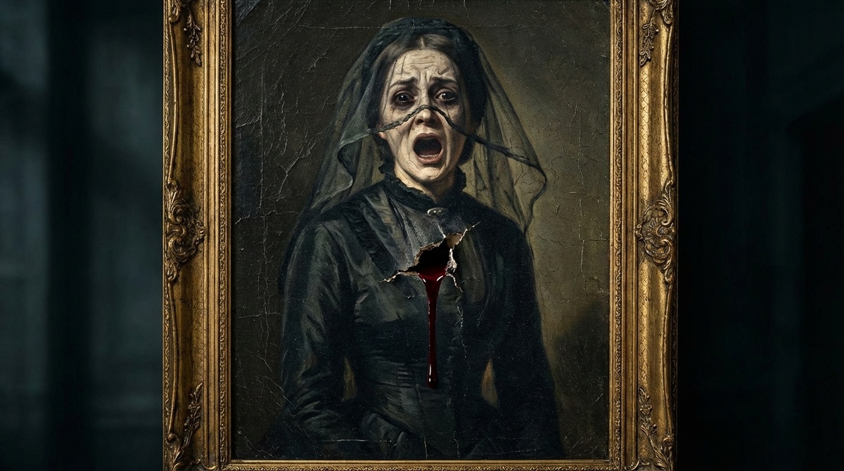 На портрете была изображена женщина в черном траурном платье. Эпоха, наверное, конец 19 века. Но самое интересное — её лицо было скрыто плотной черной вуалью. Художник так мастерски выписал ткань, что казалось, подует ветер — и вуаль колыхнется.