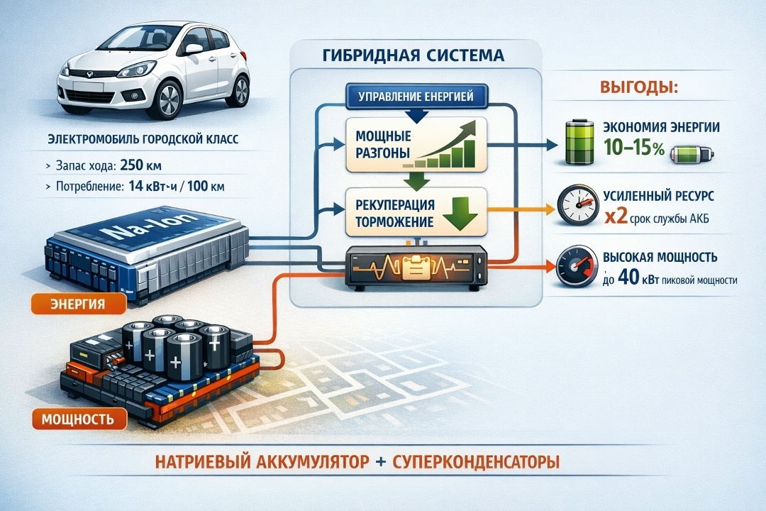 Натриевая батарея обеспечивает запас хода, работает в спокойном режиме, не любит резкие токи, при щадящей нагрузке служит долго и сохраняет емкость при отрицательных температурах. Суперконденсатор - отдаёт и принимает огромные токи, идеален для разгона и рекуперации, выдерживает миллионы циклов. Батарея питает «среднюю нагрузку», суперконденсатор — пики мощности, это снижает износ батареи и повышает эффективность. Применим схему активной гибридной системы, состоящей из батарейного контура и суперконденсаторного контуров, управляемый интеллектуальным контроллером распределяет потоки в реальном времени: прогнозирует нагрузку, минимизирует деградацию батареи, оптимизирует КПД. Натриевые батареи хуже переносят высокие токи, имеют меньшую плотность энергии, дешевле литиевых. Суперконденсатор компенсирует их слабые места - снижая стресс, повышая эффективность рекуперации. В городском цикле это может дать 10–25% экономии энергии. Прикинем результат применения для реального городского электро