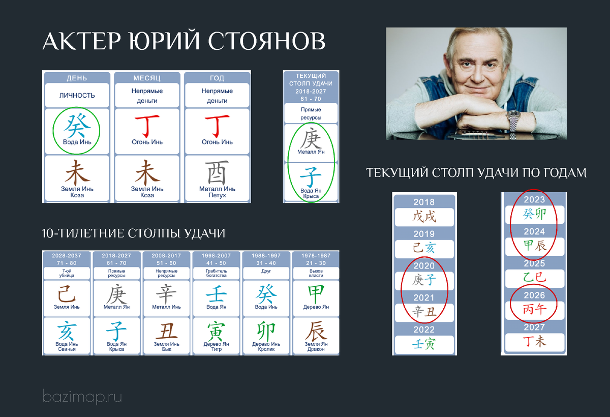 ⭐Решила обратить внимание на Актера Юрия Стоянова и разобрать его карту. Последнее время он стал активнее проявлять себя в кино. ❗Его тип личности - (Гуй) 癸 - Вода Инь - это чувствительный, пластичный, эмоционально глубокий человек, который хорошо передает нюансы - идеально для актерской профессии, особенно кино и психологических ролей. ❗Текущий столп, который начался в 2018 и продлится до 2027 года - Ян Металл на Крысе (вода) - поддерживающие и усиливающие элементы для его карты (личности). Поэтому в этот период Появляется возможность учиться, закрепляться в профессии, входить в систему, больше проектов и связей. Это значит, что и другие годы сввязанные с его карьерой, будут активно развиваться и приносить ему доход в годы Личности - Воды и Ресурса - Металла. ❗Ключевые его роли были в именно в годы с 2020 года 2020 - Металл + Вода