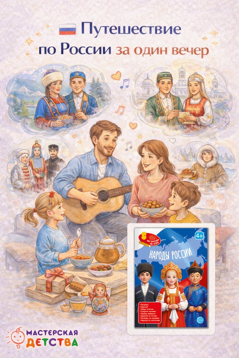 Чтобы отправиться в большое путешествие, не нужны билеты и чемоданы. Предлагаем семейную игру - знакомство с народами России через музыку, слова и вкусы. 🎶 Музыка Включаем мелодии разных регионов и пробуем угадать настроение. 🗣 Образы и разговор Кто такие буряты, татары, чукчи? Чем отличаются север и юг? Обсуждаем и задаём вопросы. 🍯 Вкусы Добавляем простые ассоциации: мёд, хлеб, чай, сухофрукты. Вкус - это большая часть культуры. А чтобы взрослым было проще, а детям интереснее, можно взять книгу «Занимательные задания. Народы России» из серии «Мы рисуем на ходу» от издательства «Творческий Центр СФЕРА». В книге: — лабиринты, задания на поиск отличий — раскраски по номерам — дорисовки по точкам и клеточкам — задания на счёт и внимание Это не просто рисование, а способ мягко познакомиться с многообразием народов России через игру и творчество. Расскажите, с какого региона начнёте своё семейное путешествие? 😊 #МастерскаяДетства