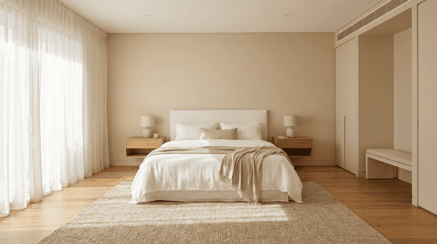 Выбор цвета влияет на восприятие пространства. Для спальни предпочтительны спокойные тона:Светлые оттенки (бежевый, кремовый) визуально расширяют пространство