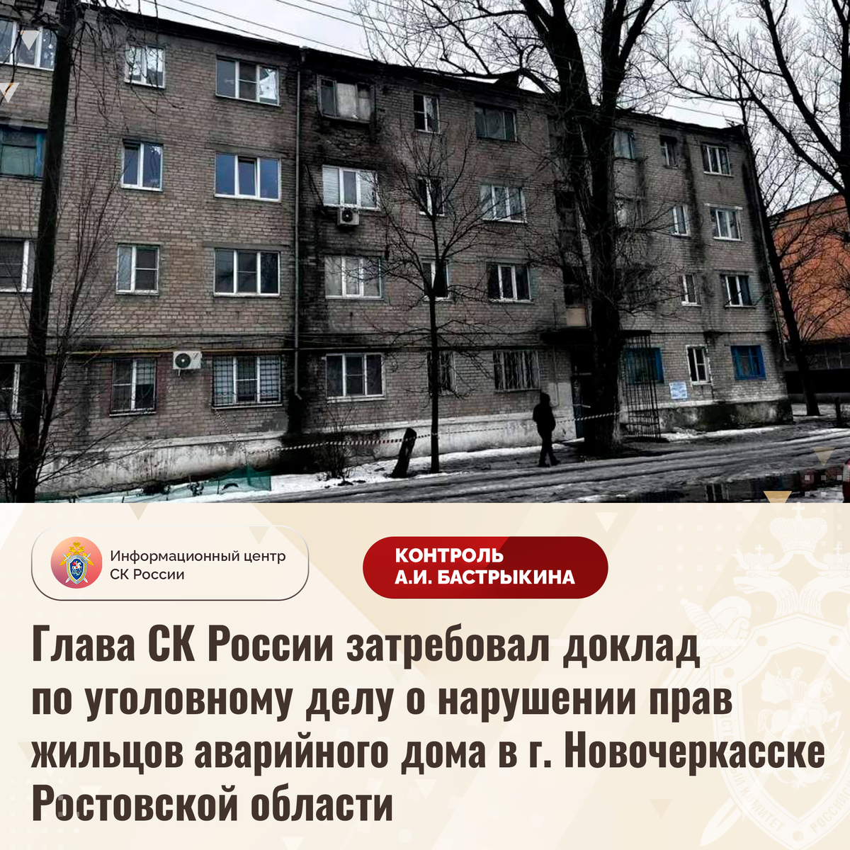 Глава СК России затребовал доклад по уголовному делу о нарушении прав жильцов аварийного дома в г. Новочеркасске Ростовской области В СМИ сообщается о нарушении прав жильцов многоквартирного дома на улице Юности в городе Новочеркасске Ростовской области. В феврале текущего года в здании 1964 года постройки произошло частичное обрушение кладки фасада, кровли, а также бетонных перемычек. Пострадавших удалось избежать. Отмечается, что строение в 2024 году признано аварийным из-за угрозы разрушения конструкций, однако до настоящего времени граждане не расселены, благоустроенное жилье им не предоставлено. В СУ СК России по Ростовской области возбуждено уголовное дело. Председатель Следственного комитета Российской Федерации Александр Иванович Бастрыкин затребовал у руководителя СУ СК России по Ростовской области Аслана Гаруновича Хуаде доклад о ходе и результатах расследования уголовного дела. Исполнение поручения поставлено на контроль в центральном аппарате ведомства. #СледственныйКомите