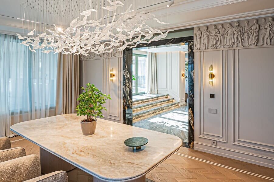 Модный ремонт квартиры 2026 активно использует натуральный камень в фактурной обработке. Мраморные и гранитные поверхности с естественными прожилками, необработанный травертин и известняк становятся акцентными элементами в кухнях, ванных комнатах и даже жилых зонах. Панно из камня на стенах создают художественные композиции.