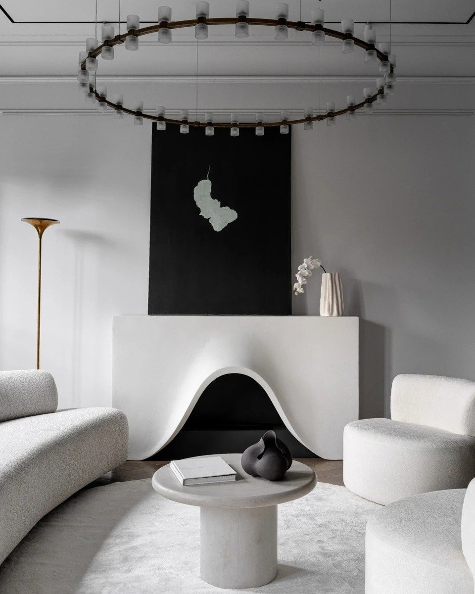 Гостиная: скульптурный камин, мягкие формы и искусство как центр
