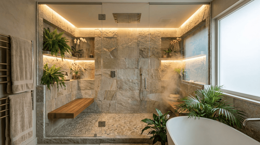 Дизайнерские возможности. Варианты дизайна ванной комнаты с душевой разнообразны — от компактных готовых кабин до индивидуальных проектов с перегородками из стекла или плитки.