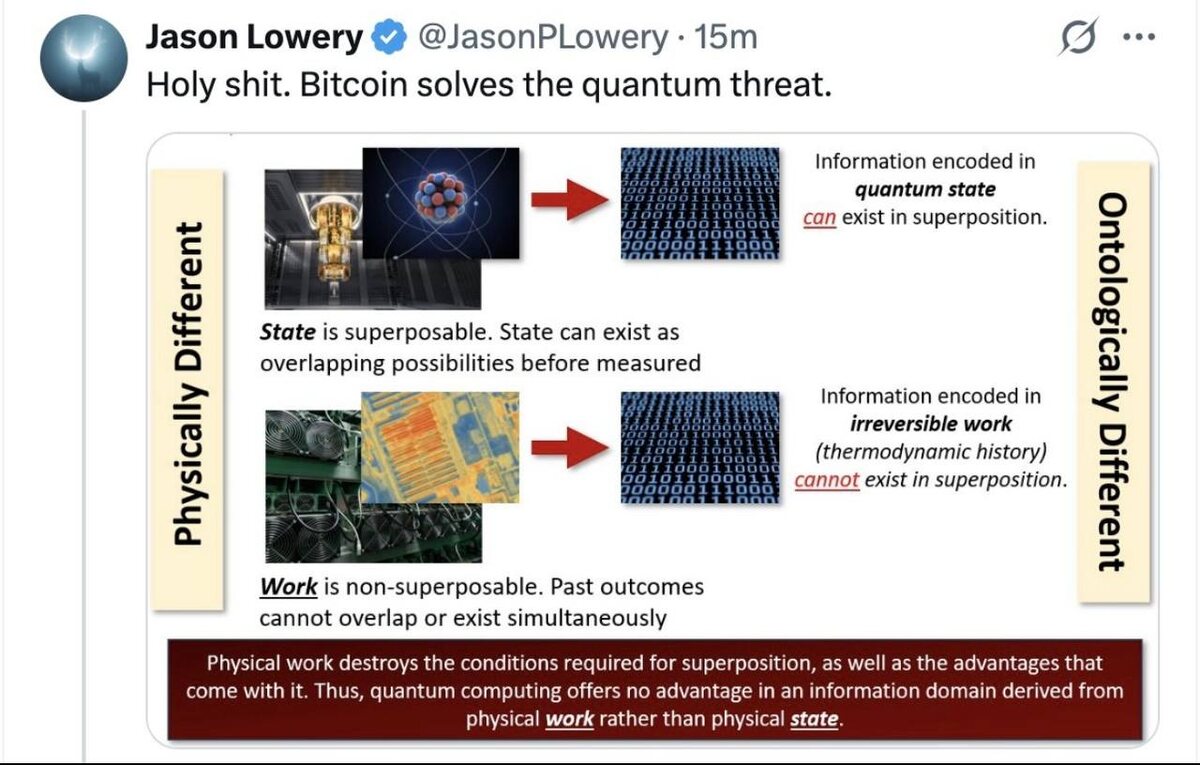 ? В ленте вспыхнула интересная мысль. Идея такая: Биткоин якобы решает квантовую угрозу. А в будущем ИИ-агенты могут начать скупать BTC, потому что он даёт им «кибер-суверенитет». Звучит как научная фантастика. Но давайте разберёмся без эмоций. Суть аргумента Лоури проста: Есть физическое состояние — его можно держать в суперпозиции. Есть физическая работа (proof-of-work) — она необратима, она уже произошла. Квантовые компьютеры дают преимущество там, где можно играть со состояниями. Но они не могут «отменить» уже совершённую термодинамическую работу. Вывод сторонников: Информация, закреплённая через физическую работу (PoW), онтологически отличается от обычных битов. А значит — квантовая угроза якобы не так страшна. Теперь холодный анализ. 1️⃣ Квантовая угроза касается не хеширования как такового, а криптографии (ECDSA). Алгоритм Шора потенциально способен ломать публичные ключи. Это не философия — это математика. 2️⃣ Биткоин можно обновить. Переход на пост-квантовые подписи