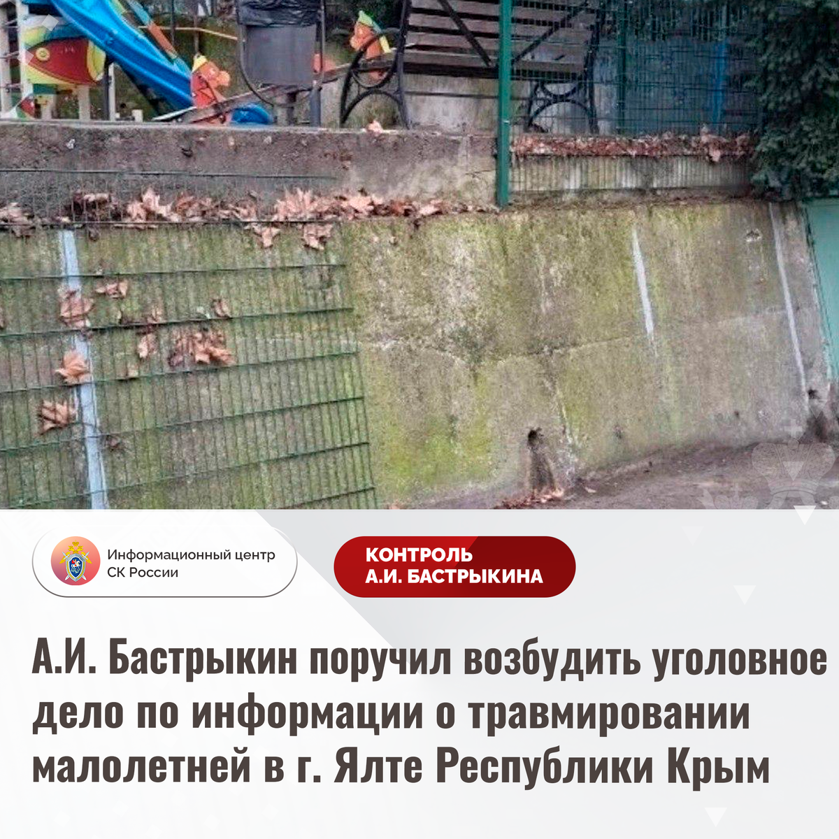 А.И. Бастрыкин поручил возбудить уголовное дело по информации о травмировании малолетней в г. Ялте Республики Крым В СМИ сообщается о травмировании 11-летней девочки на детской площадке в городе Ялте Республики Крым. В феврале текущего года малолетняя облокотилась на железное ограждение игровой зоны, которое из-за ненадлежащего состояния креплений обрушилось вместе с ней со значительной высоты. Пострадавшей потребовалась медицинская помощь. В ГСУ по Республике Крым и городу Севастополю организована процессуальная проверка. Председатель Следственного комитета Российской Федерации Александр Иванович Бастрыкин поручил руководителю ГСУ СК России по Республике Крым и городу Севастополю Владимиру Николаевичу Терентьеву возбудить уголовное дело и представить доклад о предварительных и окончательных результатах его расследования. Исполнение поручения поставлено на контроль в центральном аппарате ведомства. #СледственныйКомитет #СКРоссии #СКР #ИЦСКР #ИнформационныйЦентр #АлександрБастрыкин #Пр
