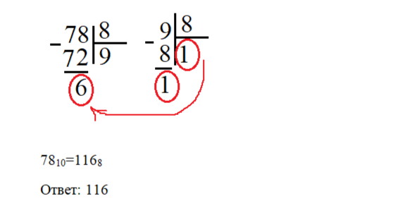 Переведите десятичное число 78 в восьмеричную систему счисления. Основание системы писать не нужно.