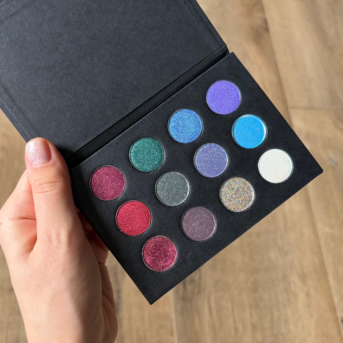 Я выбрала себе пустую магнитную палетку среднего размера + 12 сияшек, чтобы наполнить эту палетку. Сейчас покажу каждый оттенок. Сразу хочу отметить, что все оттенки наносила сухим пальцем на голую кожу, без базы. На базу будет ещё ярче и сочнее.