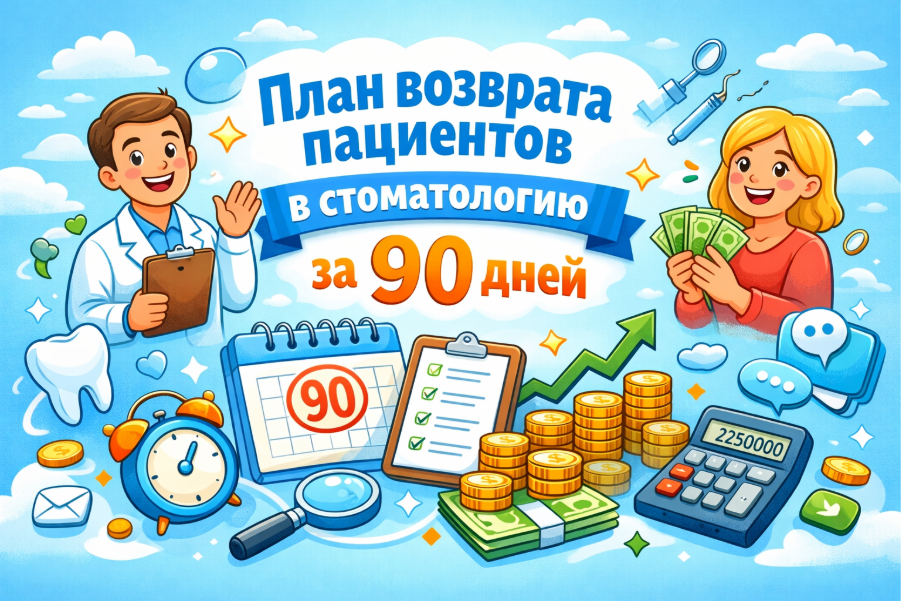 Готовый план на 90 дней с конкретными действиями, метриками и контрольными точками. Для владельцев, которые хотят не читать теорию, а сразу начать возвращать пациентов и увеличивать выручку.