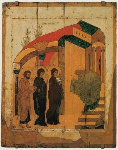 Древнерусские иконы XV века Симеон Богоприимец в иерусалимском храме принимает на руки Младенца - Христа, которого передает ему Богоматерь, согласно евангельскому тексту, ему было предсказано, что "он не увидит смерти, доколе не увидит Христа Господня". Позади Богоматери Иосиф обручник держит двух белых горлиц - жертва, положенная по Закону Моисееву, за спиной старца Симеона пророчица Анна, прославляющая явившегося Мессию.