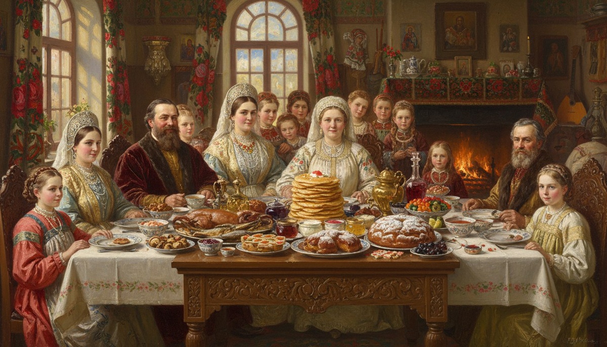 В четверг дом Морозовых сиял. Когда на стол подали огромную стопку блинов, по залу разлился невероятный аромат. Блины были тонкими, как кружево, и сияли, словно маленькие солнышки.