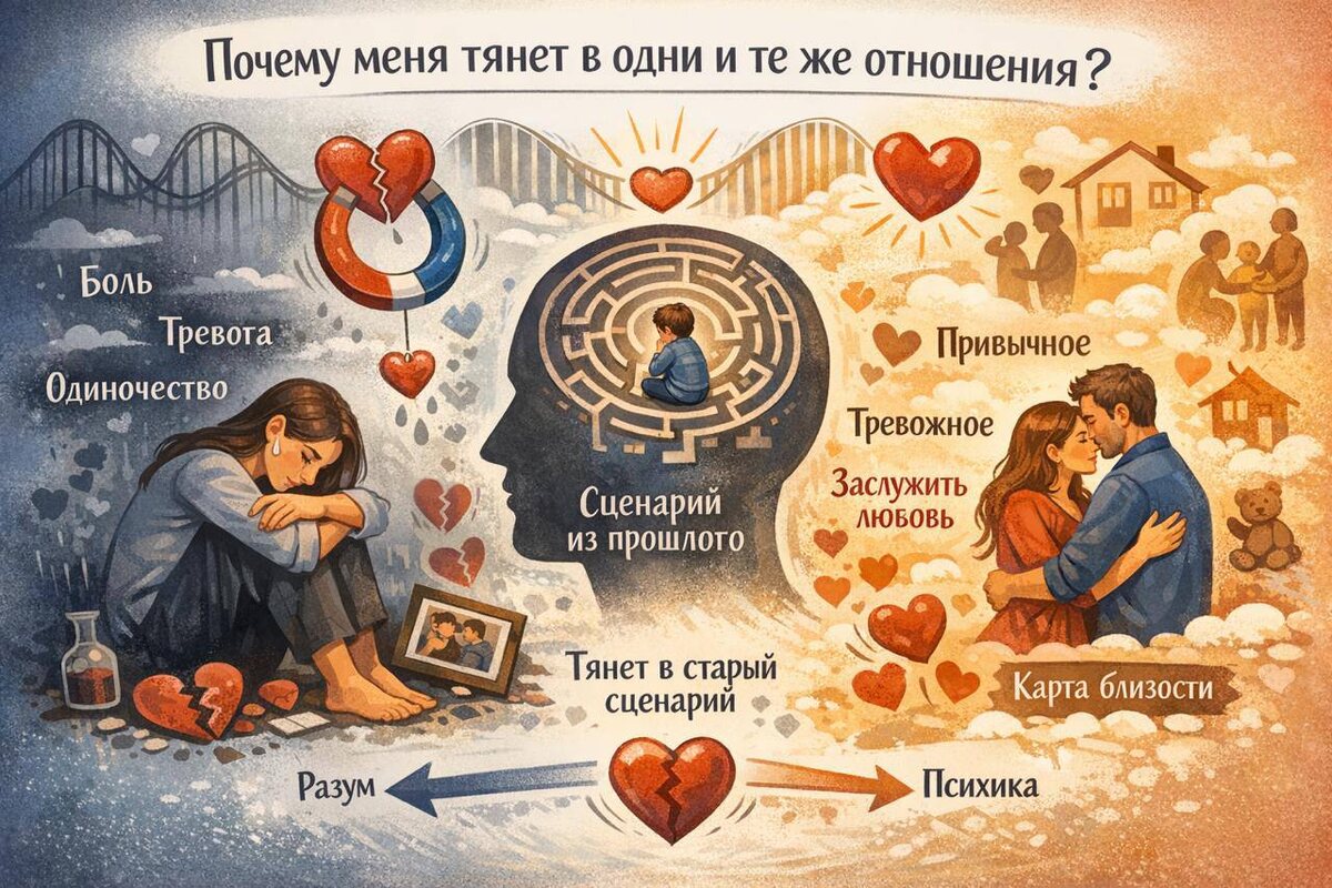 Почему меня снова туда тянет, хотя разумом я всё понимаю? Дело не в выборе, а в настройке психики. Мы не выбираем отношения «с нуля». Мы входим в них с уже сформированной внутренней картой близости. Эта карта складывается очень рано – из того, кто был с нами рядом и как себя вели, как откликались, как любили, как причиняли боль. И психика тянется не к «здоровому», а к знакомому. Если в близости когда-то было: Именно такие чувства и будут восприниматься как «любовь». Спокойствие может казаться скукой. Надёжность – подозрительной. Уважение – непривычным. А эмоциональные качели – живыми и настоящими.Это не ошибка и не глупость Повторяющиеся отношения не признак того, что человек «ничему не учится». Это признак того, что внутри: Психик