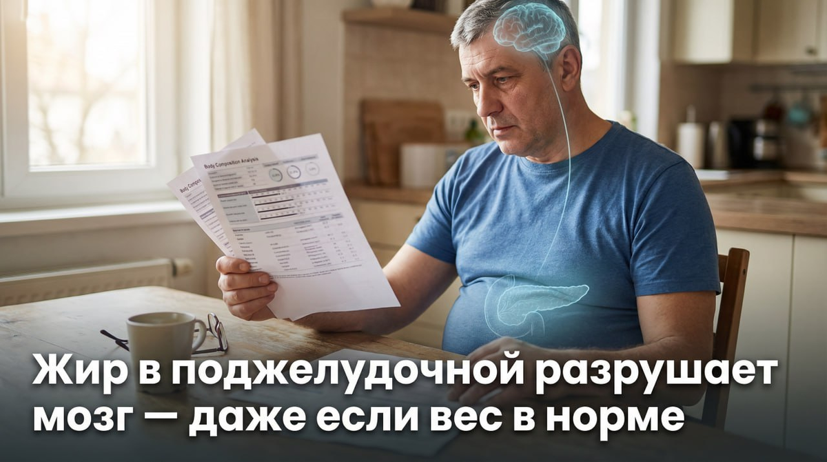 Каждый четвёртый человек с нормальным ИМТ носит в себе скрытую бомбу: эктопический жир в органах. Он не виден снаружи, не отражается на весах — но может уменьшать серое вещество мозга и ускорять когнитивное старение. Исследование 2026 года на 26 000 человек показало: жир в поджелудочной железе опаснее для мозга, чем жировая печень.