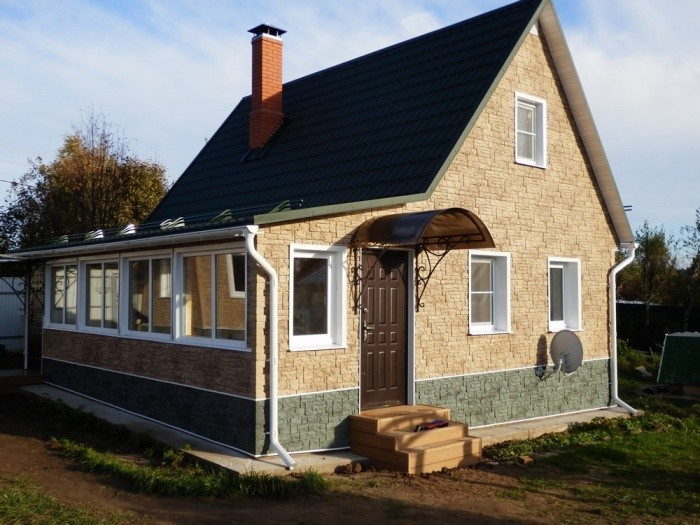 Не любой искусственный камень подойдет для отделки дома из панелей. Это связано с тем, что некоторые виды имеют значительный вес. Общее увеличение массы здания скажется на фундаменте, т. к. изначально он рассчитывается только под вес конструкции из СИП-панелей. Кроме того, тяжелый камень может разрушить конструкцию самой панели. Именно поэтому применяется гибкий камень. Это условное обозначение, которое описывает его свойство. Изготавливается отделка из акриловой смолы с добавлением мраморной крошки. Преимуществом такого вида отделки является превосходный внешний вид.