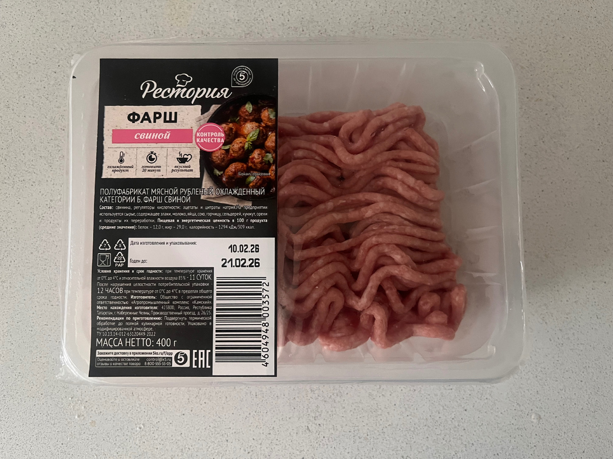 Использовала магазинный фарш. Это из свинины. Так то нам с любимкой больше всего нравится куриный, он больше диетический. А Тимке все равно, лишь бы было вкусно. Поэтому петелинки не было и мне пришлось взять этот вид.