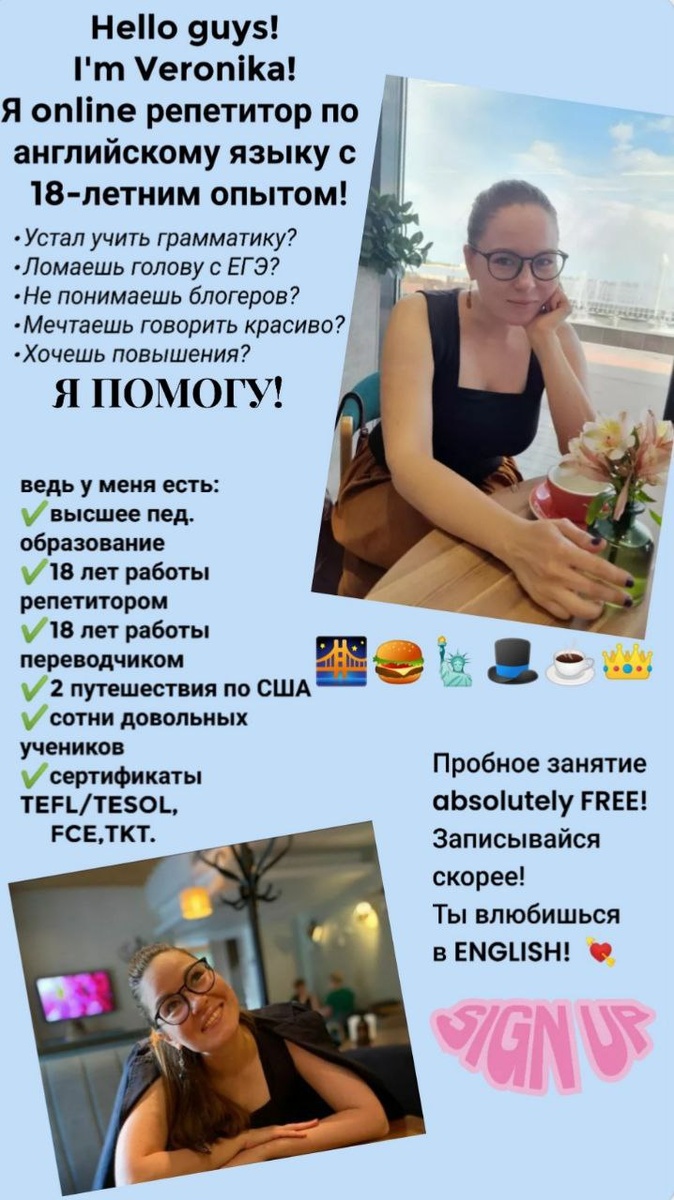 !🇺🇲 Howdy! I'm Veronika.☺️😉 С радостью помогу Вам освоить АНГЛИЙСКИЙ ЯЗЫК! 🎯 🎯 Среди моих студентов были IT-специалисты, менеджеры спортивной,сельскохозяйственной и других сфер, медики, работники торговли, коллеги-преподаватели английского, студенты как ин.яза,так и других профилей, школьники (ЕГЭ, ОГЭ, общий курс) и даже детки 3х лет с запросом быть няней -иностранкой 😝. Мы ДОСТИГЛИ их целей! 💪 А каковы Ваши цели? Хотите их достичь? Сейчас я СПЕЦИАЛИЗИРУЮСЬ на взрослых, студентах, подростках. Вы один из них? В работе я использую мозг 🧠и фантазию, материалы📚 Oxford, Cambridge, Longman и др.,платформу Миро, а также аутентичные видео,аудио и тексты. Каждое занятие интерактивно, энергично⚡ и нескучно. Пишите 📝мне скорее, задавайте вопросы и давайте начинать погружение в удивительный мир английского! 🌊🐳 тг @Vero_fly_high #английский #english