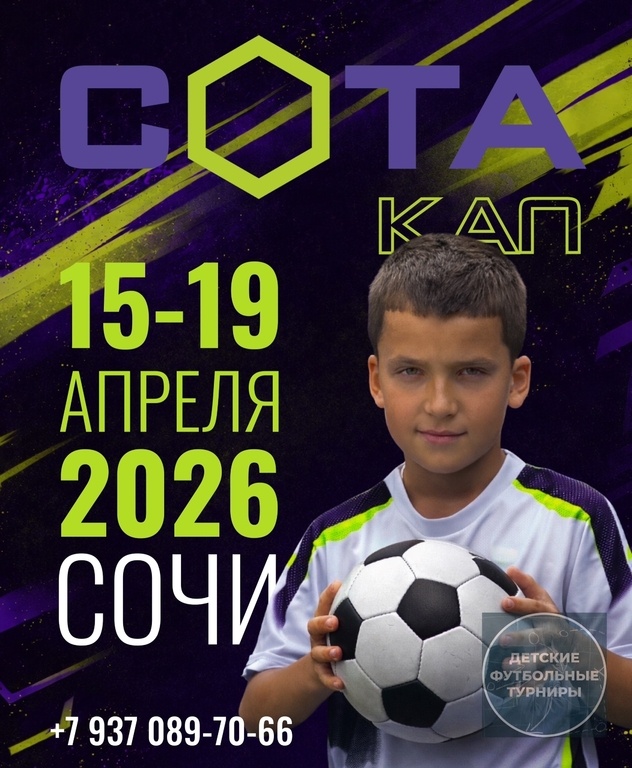 ). https://vk.ru/cup.sota 🟣 Даты проведения: с 15 апреля по 19 апреля 2026 года 🟣 Проживание в Сочи Парк Отель 🟣 Участвуют команды 2013-2019 г. р. 🟣 Бонусы тренерам 🔥 В каждом этапе ровно 12 команд , со всех уголков России. 🔥 Каждая команда в призах! 🔥 Также награждаются лучшие игроки турнира и каждого матча! Заявки на участие и дополнительную информацию можно получить по телефону +7 937 089-70-66 или в наших соцсетях: Max: https://max.ru/u/f9LHodD0cOL21KJYuZtqyIB4K40bvktJnUrc_QAWSZYNd3pHpYnLxZz3SnE Вк: https://vk.ru/cup.sota Instagram: https://www.instagram.com/sotacup?igsh=MWNhY3R4eHBqczc3MQ==&utm_source=qr Telegram: @sotacup (https://vk.com/club146024639) Подробнее в пдф файле ⬇ -— #ФутбольныйТурнирАпрель2026 #ФутбольныйТурнирЮгРоссии2026 #ФутбольныйТурнирСочи2026 #ФутбольныйТурнирСочи2013гр #ФутбольныйТурнирСочи2014гр #ФутбольныйТурнирСочи2015гр #ФутбольныйТурнирСочи2016гр #ФутбольныйТурнирСочи2017гр #ФутбольныйТурнирСочи2018гр #ФутбольныйТурнирСочи2019гр Источник: http