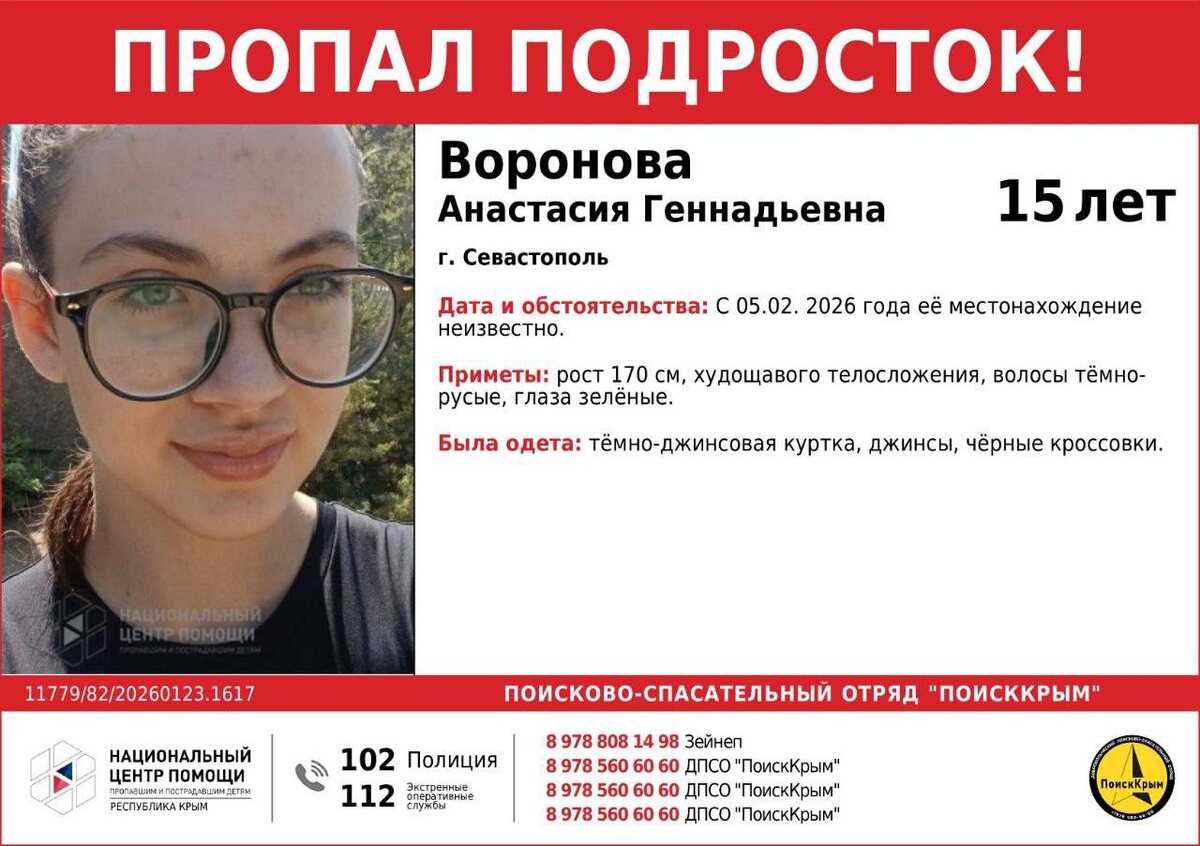 ! #Пропала #Воронова Анастасия Геннадьевна, 15 лет (2010 г.р.) г. #Севастополь С 5 февраля 2026 года её местонахождение неизвестно. Просим сообщать любую информацию, связанную с поиском без вести пропавшей, по телефону горячей линии #ПоискКрым +79785606060 либо по номеру телефона +79788081498 (инфорг поиска Зейнеп) ✈️Севастополь | Мы в MAX📲