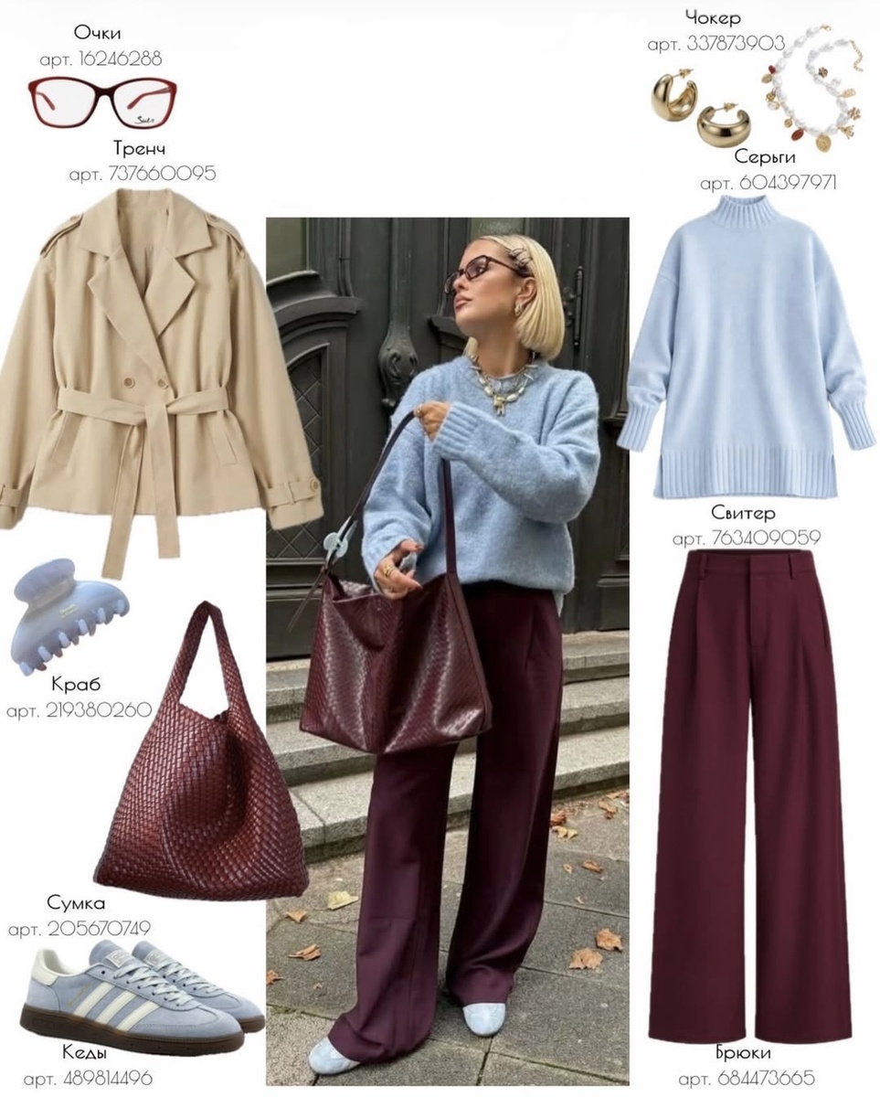 Этот образ — отличный пример того, как выглядеть ярко без крика. Голубой свитер и аккуратные кеды создают свежесть и лёгкость, бордовые брюки и сумка дают глубину и статус, а бежевый тренч связывает всё в гармоничную композицию. Очки, серьги и чокер добавляют «завершённость», а крабик для волос делает образ ухоженным и собранным.