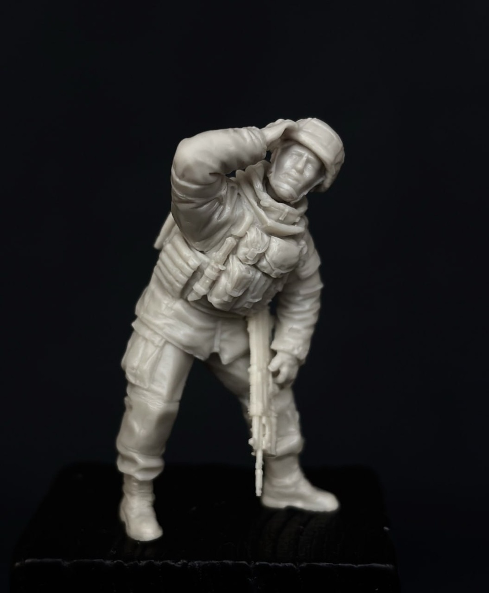 Реалии современной войны показывают, что основная угроза пехоты и техники на поле боя, это FPV и сбросы. Исходя из этого возникла идея создать « Царицу полей» именно в такой обстановке. Раненый сбросом боец ( только отправится в литейку). И его товарищ высматривающий угрозу. Бойцы из серии «Герои терриконов». Без тактикула и всяких приблуд…. В стандартном снаряжении мотострелковых войск РФ.