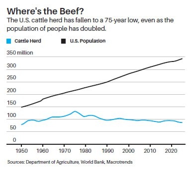 Интересный график, население США по годам в сравнении с количество крупнорогатого скота. Это можно конечно объяснять курицей, но это же США там они гамбургеры и стейки любят.