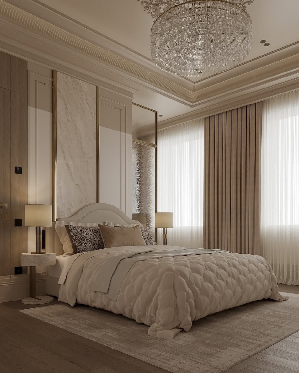 Элегантная спальня, оформленная в нежных бежево-кремовых тонах