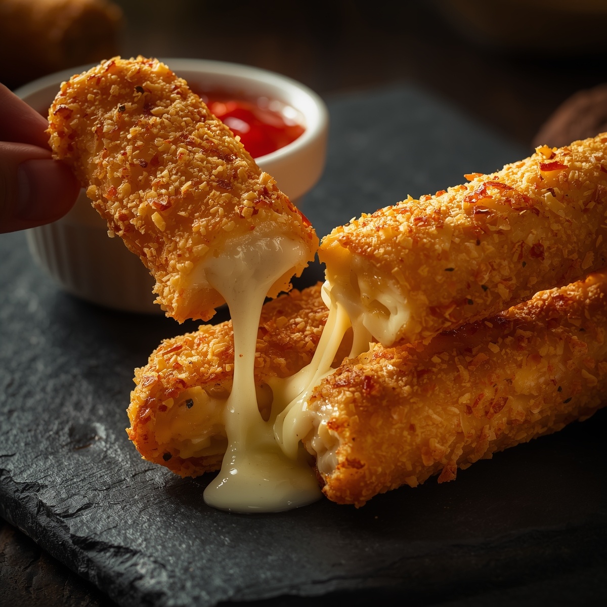 Если хотите особенно хрустящую корочку, после первого круга "мука-яйцо-сухари" окуните палочку снова в яйцо и ещё раз в сухари. Получится толстый панцирь, под которым сыр плавится до идеальной тягучести.