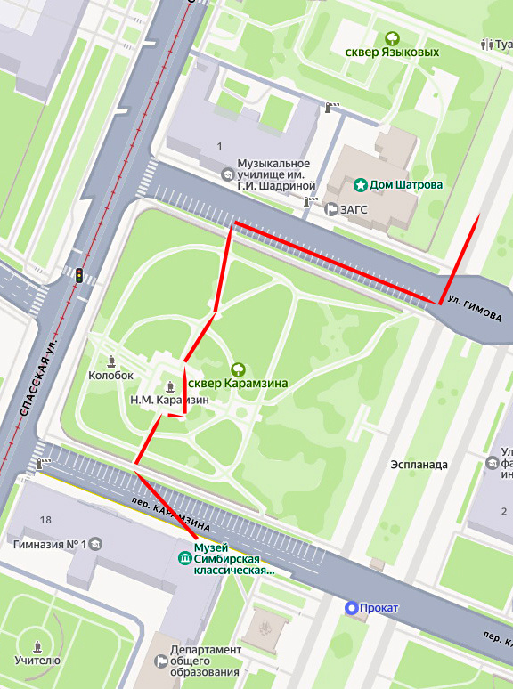 В предыдущей статье завершилась наша экскурсия в музей «Симбирская классическая гимназия», который находится в переулке Карамзина. До этого мы передвигались на экскурсионном автобусе, сегодня отправимся на пешеходную прогулку по городу. Первая достопримечательность на нашем пути– Сквер имени Карамзина (другие названия – Карамзинский сквер, Карамзинский сад, Сквер Карамзина). Один из входов в Сквер Карамзина находится напротив музея «Симбирская классическая гимназия», на другой стороне переулка Карамзина.